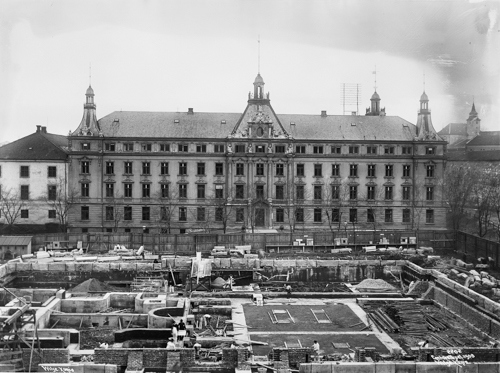 Bygningen rett til høyre for enden av nybygget, er Justisdepartementets bygning langs Grubbegaten. (Foto: Anders B. Wilse/Oslo Museum)