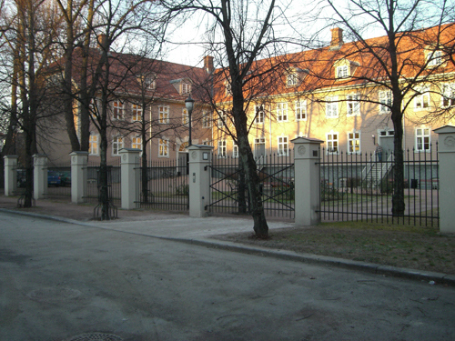 Justisdepartementets bygning sett gjennom alléen fra Akersgaten. I venstre bildekant østfløyen av det tidligere Militærhospitalet.