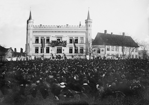 3. november 1907 ble avtroppet statsminister Christian Michelsen hyllet av folketog på Festningsplassen, nær stedet der Statsministerens kontor flyttet inn i september 2011. Michelsen sto på trappen til den daværende Kommandantgården (reist i 1840-årene). Til høyre i bildet Plassmajorgården (reist 1800). (Foto: Ludwik Szacinski/Oslo Museum).