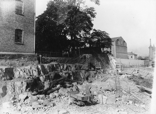 Riving av bastionene Gyldenløve og Wedel i årene 1902-1904, for å føre Skippergaten gjennom til Vippetangen. I venstre bildekant Hovedarsenalet, til høyre for trærne Artillerimagasinet, deretter noe av Artilleriets kontorbygning. I høyre bildekant Artilleriverkstedet. (Foto: Oslo Museum).