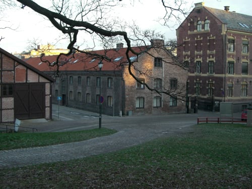 Midt i bildet Det norske militære Institutt (Krigsskolen) i Tollbodgaten 10, tidligere Jens Bjelkes gård. Til venstre Dronningens gate 13, der statsråd Marcus Gjøe Rosenkrantz bodde og holdt statsrådsmøter høsten 1814. I dag holder Riksantikvaren til i en ombygd utgave av gården.