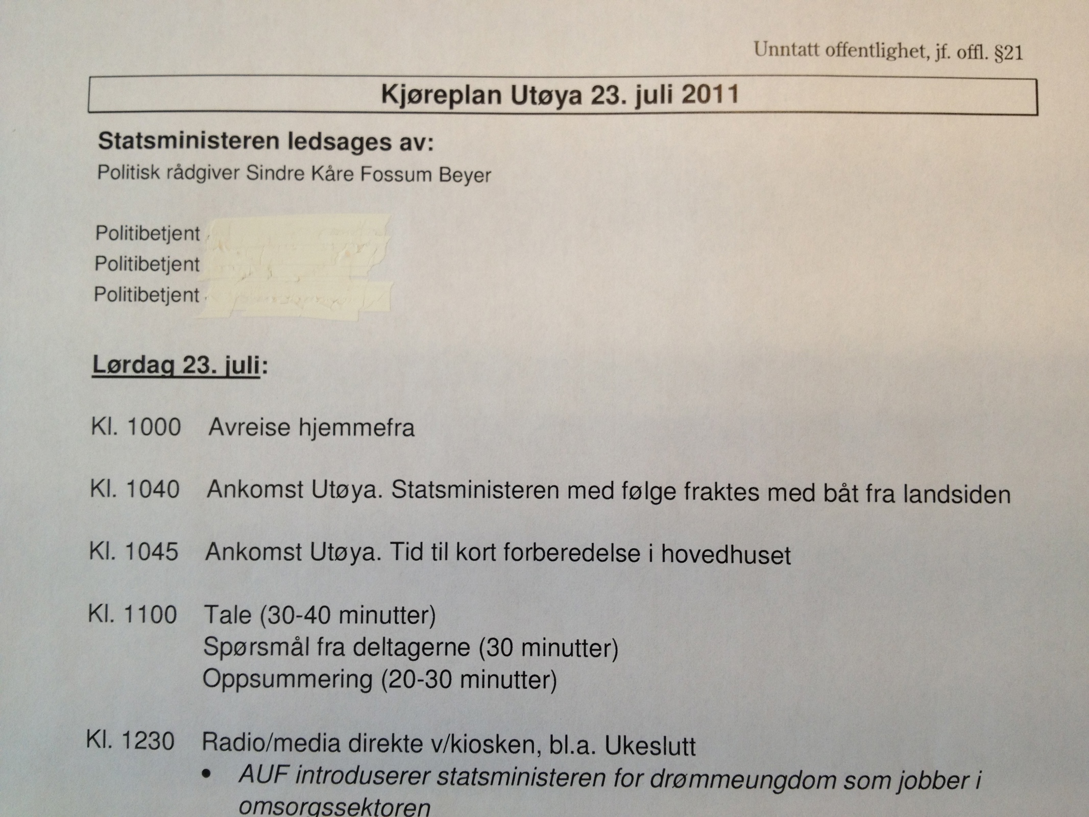 Kjøreplan for besøket på Utøya lørdag 23. juli 2011, status 19. juli.