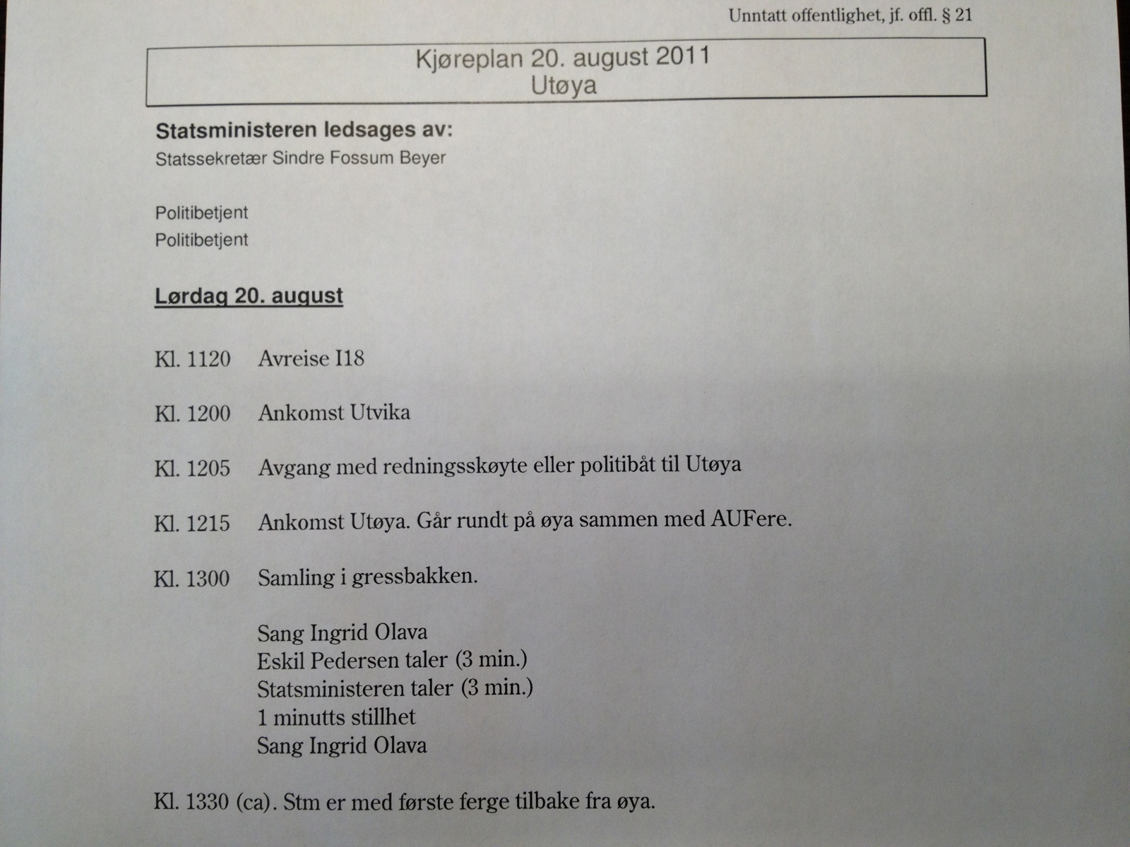 - kjøreplan for besøket på Utøya lørdag 20. august 2011.