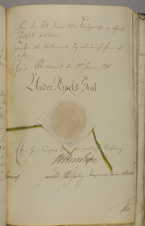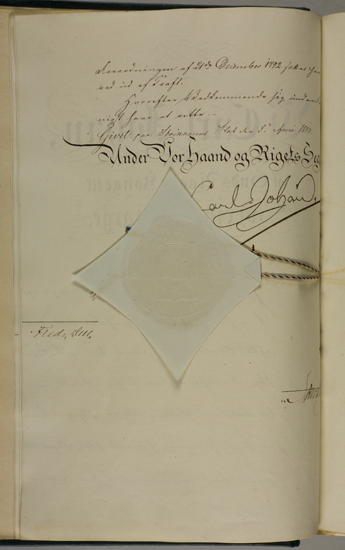 Et av de tidligste lovdokumentene med snor og rikssegl, en provisorisk anordning av 17. januar 1815. Snoren er i de svenske flaggfargene blått og gult, riksseglet er preget inn etter at snoren er festet med lakk og papiroblat. Den som har signert i Christiania "Under Rigets Segl" og "Efter Hans Kongelige Majestæts naadigste Befaling" er Hans Henrik von Essen, stattholder i Norge 1814-1816.