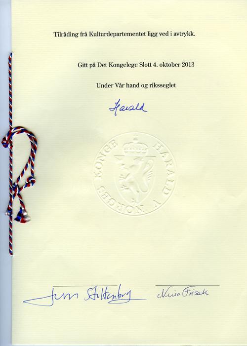 Et av de siste lovdokumentene med flaggfarget tråd, proposisjon om endringer i pengespilloven, passerte statsråd 4. oktober 2013. Det er signert av kong Harald V, kontrasignert av statsminister Jens Stoltenberg og parafert av statsrådsekretær Nina Frisak. Dokumentet ble bundet sammen av seniorkonsulent Toril Fuglerud Borthen. Det var nå flere tiår siden det var slutt på å feste snoren med lakk og papiroblat før riksseglet ble preget inn.