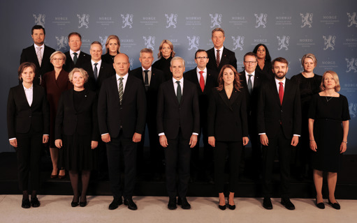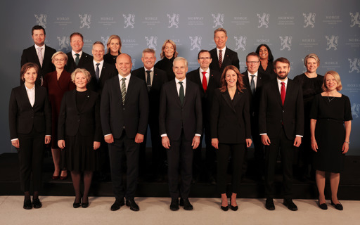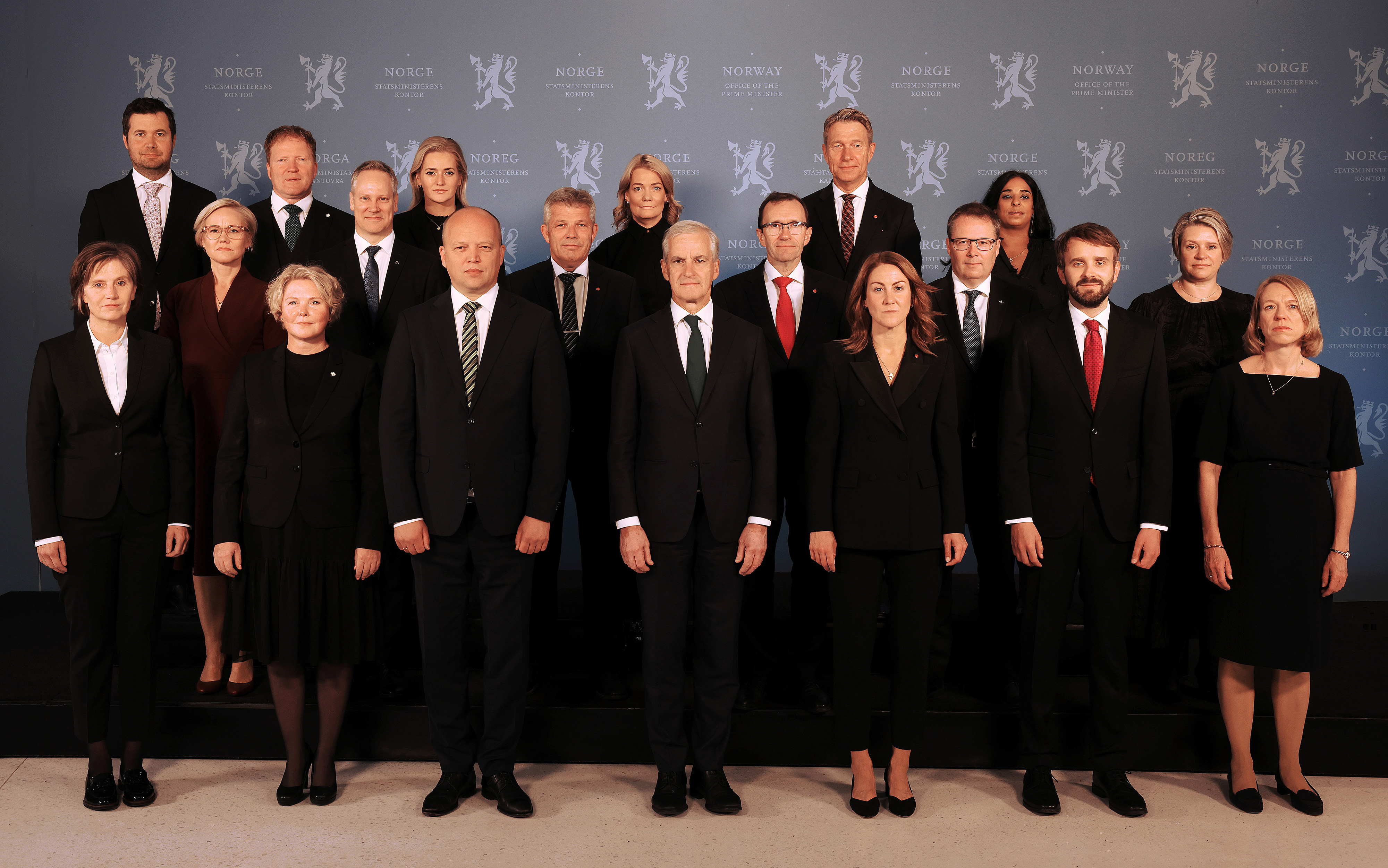 Regjeringen Støre på Sundvolden 5. januar 2026. Første rad fra venstre: Energiminister Terje Aasland, utenriksminister Espen Barth Eide, helse- og omsorgsminister Jan Christian Vestre, statsminister Jonas Gahr Støre, finansminister Jens Stoltenberg, samferdselsminister Jon-Ivar Nygård og kultur- og likestillingsminister Lubna Jaffery. Andre rad fra venstre: Fiskeri- og havminister Marianne Sivertsen Næss, kunnskapsminister Kari Nessa Nordtun, digitaliserings- og forvaltningsminister Karianne Oldernes Tung, kommunal- og distriktsminister Bjørnar Skjæran, næringsminister Cecilie Myrseth og klima- og miljøminister Andreas Bjelland Eriksen. Tredje rad fra venstre: Barne- og familieminister Lene Vågslid, forsknings- og høyere utdanningsminister Sigrun Aasland, justis- og beredskapsminister Astri Aas-Hansen, forsvarsminister Tore O. Sandvik, arbeids- og inkluderingsminister Kjersti Stenseng, utviklingsminister Åsmund Grøver Aukrust og landbruks- og matminister Nils Kristen Sandtrøen. Foto: Torbjørn Kjosvold / Forsvaret