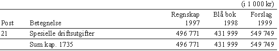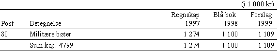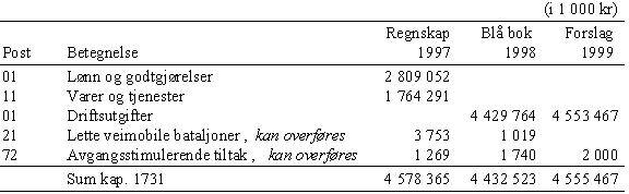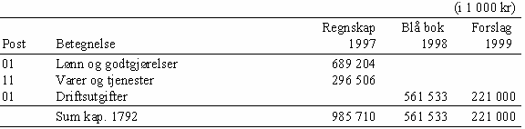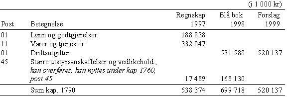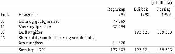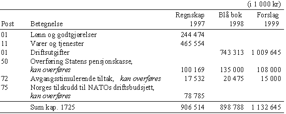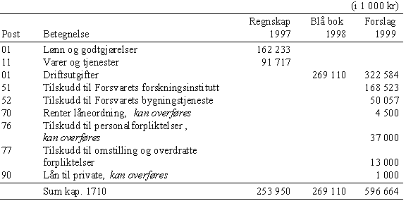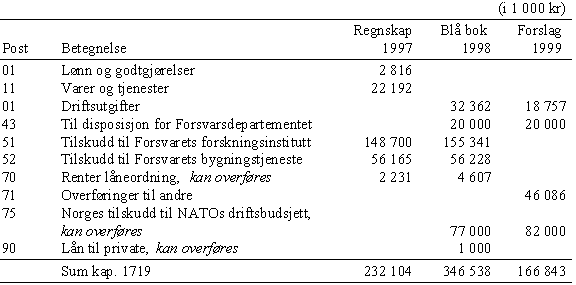 Budsjettforslaget for 1999 har en økning i forhold til Blå bok for 1998. Denne økningen skyldes i hovedsak at enkelte poster under dette kapitlet tidligere lå under kap 1719. Dette gjelder utgifter til oppdragsfinansiering for Forsvarets forskningsinstitutt med 14,3 mill kroner og midler avsatt til oppfølging av eget prosjekt som arbeider med å vurdere nye styrings- og organisasjonsformer for Forsvarets støttevirksomheter (STYFOR) med 3 mill kroner. Forøvrig er budsjettet tillagt lønns- og priskompensasjon.