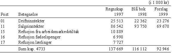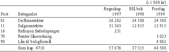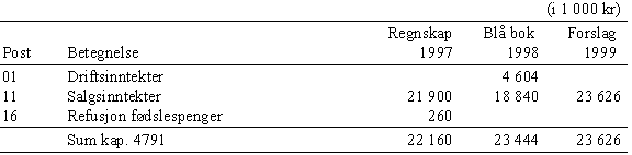 I 1999 forventer instituttet en samlet omsetning på 371,7 millioner kroner. Dette inkluderer et ekstraordinært investeringstilskudd over kapittel 1710 post 51 på 10,7 millioner kroner for å ferdigstille fornyelsen av infrastrukturen på IT-området og ivareta de ekstraordinære kostnader instituttet påføres i forbindelse med år 2000 problemet. I tillegg avsettes det over kapittel 1710 post 51 et ekstraordinært tilskudd på 2,5 millioner kroner i forbindelse med flytting av toksikologibygget. De ekstraordinære tilskuddene vil være av engangskarakter. Instituttets omsetning eksklusiv de ekstraordinære tilskuddene vil være 358,5 mill kroner.