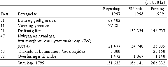 I 1999 vil Akershus festning - skolesenter bli videreført som det eneste prosjekt over 25 mill kroner. Prosjektet belaster kapittel 1795, post 47 med totalt 30,5 mill kroner. Resten belastes kap 1760.