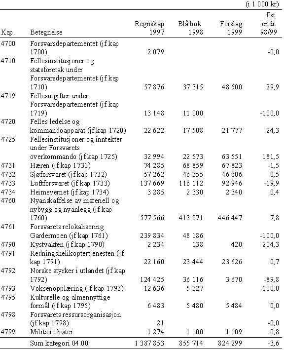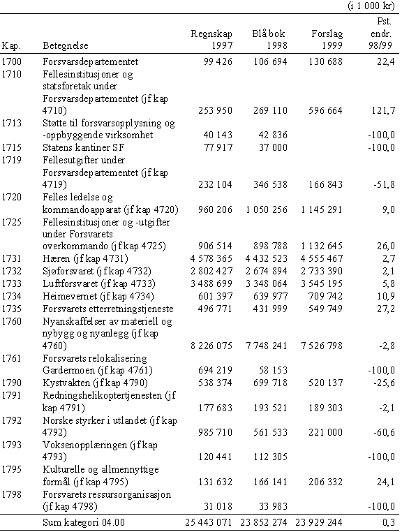 De følgende to tabeller viser nominelle endringer på de forskjellige kapitler. Det betyr at det i forslaget for 1999 er lagt inn priskompensasjon for antatt prisstigning i 1999 og virkningen i 1999 av lønns- og soldatoppgjøret i 1998. For å få fram de reelle endringer på hvert kapittel, må sammenlikningen mellom 1998 og 1999 gjøres eksklusive pris- og lønnskompensasjon.
