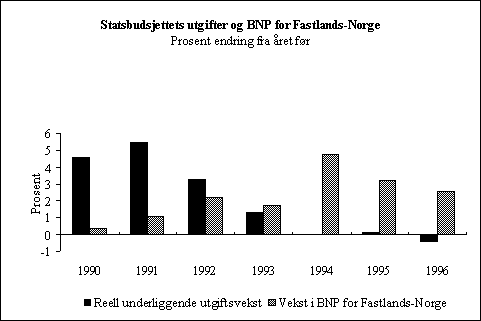 Figur 2.1 viser den underliggende veksten i statens utgifter og veksten i BNP for Fastlands-Norge i perioden 1990-1996. Som det går fram av figuren, har det skjedd en klar innstramming i budsjettet de siste årene. For en nærmere beskrivelse av begrepet “underliggende utgiftsvekst” vises det til Nasjonalbudsjettet 1996 (St.meld. nr. 1 (1995-96)), avsnitt 3.1.3.