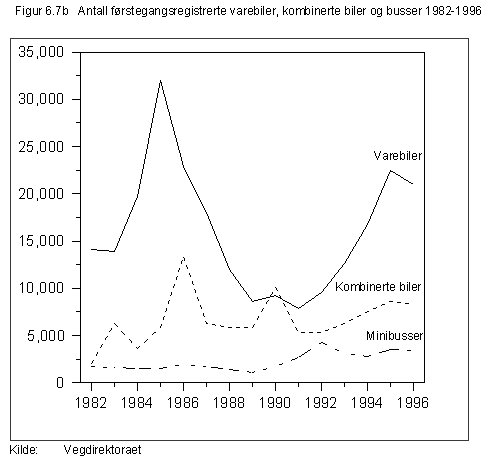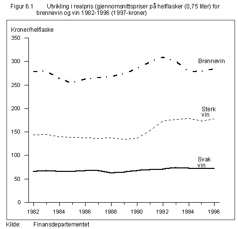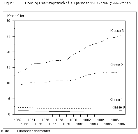 Figur 6.12 viser utviklingen i forbruk av mineraloljeprodukter i perioden 1982-1996. Forbruket av autodiesel er nesten doblet i perioden (det vises til omtale i kapittel 6.6.7 om avgiften på autodiesel). Forbruket av øvrige mineraloljer varierer i perioden. Figur 6.13 viser utviklingen i realprisen på lett fyringsolje og i reelle avgifter på lett og tung fyringsolje i perioden 1982-1996. Realprisen på lett fyringsolje har de siste årene ligget på et nivå som er lavere enn nivået i begynnelsen av 80-årene og høyere enn nivået i slutten av 80-årene. De til dels store svingningene i realprisen på fyringsolje var fram til midten av 80-årene i hovedsak forårsaket av endringer i råoljeprisene. Nivået på realavgiftene nådde en topp i 1991 da CO•2-avgiften ble innført. Deretter ble det samlede avgiftsnivået redusert. Fra 1993 har det vært et stabilt nivå på avgiftene målt i realverdi.