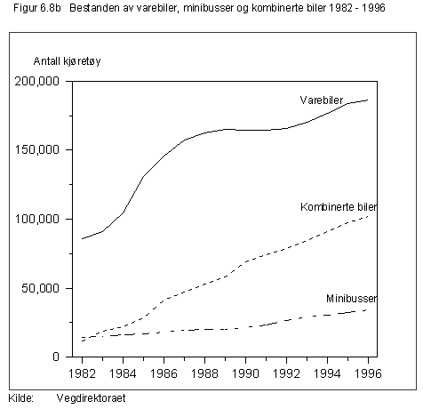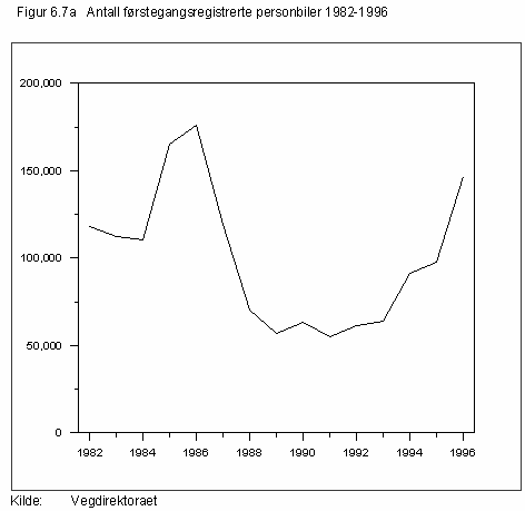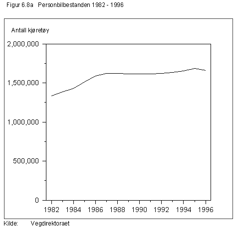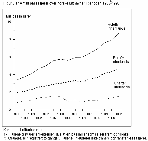 Figur 6.14 viser utviklingen i antall passasjerer over norske lufthavner i årene 1982-1996. I denne perioden har det både i rutetrafikken til og fra utlandet og i rutetrafikken innenlands vært en relativt jevn vekst med mer enn en dobling av antallet passasjerer. Antallet charterpassasjerer til utlandet steg jevnt fram til 1987, men sank deretter til omtrent det halve. De siste årene har det igjen vært en jevn stigning i antallet charterpassasjerer opp mot nivået i 1987. I første halvår i år økte antallet passasjerer i rutetrafikken med 7 prosent i forhold til samme periode i 1996, mens det tilsvarende tallet for chartertrafikken er 17 prosent. Den sterke veksten i passasjerantallet for chartertrafikken skyldes sannsynligvis at denne er svært konjunkturavhengig. Generelt synes avgiftsendringer som er gjennomført de senere år, ikke i særlig grad å ha påvirket veksten i flytrafikken.