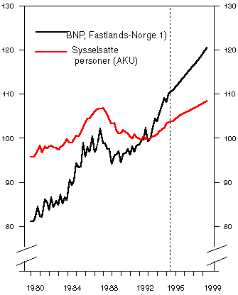 Med utgangspunkt i anslagene for produksjonsveksten i fastlandsøkonomien, samt utviklingen i arbeidsmarkedet så langt i år, anslås nå sysselsettingen å øke med hele 40000 personer fra 1994 til 1995. Dette er klart sterkere enn i fjor, og veksten er om lag dobbelt så sterk som den gjennomsnittlige sysselsettingsveksten i Norge de siste 30 årene. Fra 1995 til 1996 anslås en økning i sysselsettingen på om lag 30000 personer.