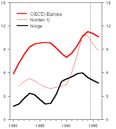 Arbeidsledigheten i OECD-området nådde en topp i første halvår 1994 med 8,3 pst. av arbeidsstyrken. Ledigheten ventes å falle til knapt 8 pst. i år og ytterligere noe til neste år. Også i våre nordiske naboland har ledigheten nå avtatt noe etter den sterke økningen de siste årene. Det ventes at ledigheten vil avta ytterligere neste år.