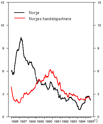 Prisstigningen hos våre handelspartnere har vært avtakende siden 1990, og fra 1993 til 1994 økte konsumprisene med i gjennomsnitt 2,4 pst. Fra 1994 til 1995 anslås prisstigningen hos våre handelspartnere til 2 1/2 pst., og for 1996 ventes den å bli 2 3/4 pst. Også timelønnsveksten har falt markert de siste årene. Timelønnsveksten i industrien hos våre handelspartnere kom i fjor ned i 3 pst. på årsbasis, men anslås å stige til 4 pst. i 1995 og 4 1/2 pst. i 1996.