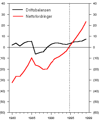 Overskuddet på driftsregnskapet overfor utlandet anslås å øke noe også etter 1996. Mot slutten av tiåret kan Norge ha bygget opp betydelige nettofordringer overfor utlandet.