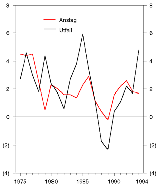 En illustrasjon på usikkerheten i de makroøkonomiske framskrivingene gis i figur 2.5, som viser anslagene i nasjonalbudsjettene de siste 20 årene for BNP-veksten i Fastlands-Norge sammenliknet med utfallet slik det følger av nasjonalregnskapet. Figuren viser at det særlig er styrken i konjunkturutslagene som er blitt undervurdert. Dette gjelder både oppgangen midt på 1980-tallet, nedgangen som startet på slutten av 1980-tallet og den oppgangen vi nå er inne i.