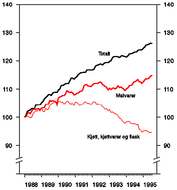 Figur 6.1 Konsumprisindeksen for enkelte varegrupper. Januar 1988=100