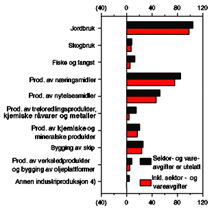 Figur 6.2 ERA-indikator [1] for støtte til næringslivet som følge av skjerming fra utenlandsk konkurranse [2]. Gjennomsnitt for 1989 og 1991. Prosent av faktorinntekt og mill. kroner