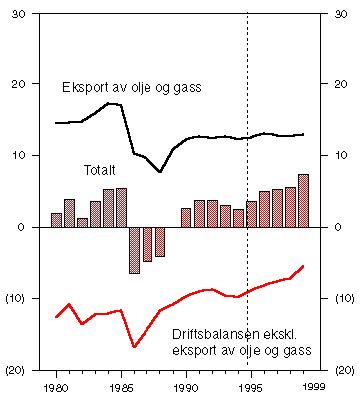 I 1994 var det ifølge det reviderte nasjonalregnskapet et driftsoverskudd på 21 mrd. kroner, tilsvarende 2,4 pst. av BNP. For 1995 anslår en nå et overskudd på vel 33 mrd kroner, jf. tabell 2.14, som er noe lavere enn til Revidert nasjonalbudsjett. Anslaget for eksportverdien av råolje og naturgass er betydelig nedjustert, men i motsatt retning trekker en nedjustering av direkte import av varer og tjenester til oljevirksomheten. Denne siste justeringen er knyttet til en definisjonsendring som følge av hovedrevisjonen av nasjonalregnskapet. I 1996 anslås overskuddet på driftsbalansen til vel 48 mrd. kroner. Den kraftige økningen fra 1995 til 1996 kan i hovedsak tilskrives økt olje- og gasseksport. Utover i perioden reduseres underskuddet på rente- og stønadsbalansen som følge av økende nettofordringer overfor utlandet. Dette, sammen med ytterligere vekst i eksporten av råolje og naturgass, bidrar til at driftsoverskuddet øker ytterligere.