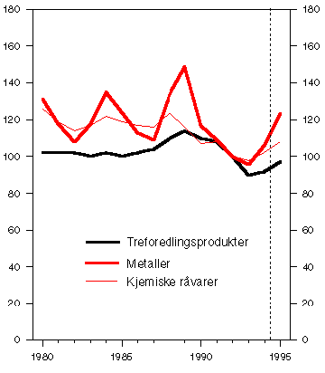 Det er betydelig usikkerhet knyttet til utviklingen i prisene for den tradisjonelle vareeksporten framover. Spesielt stor usikkerhet er knyttet til verdensmarkedsprisen på industrielle råvarer, deriblant metaller, som i 1994 utgjorde om lag 36,5 pst. av Norges tradisjonelle vareeksport. Tradisjonelt svinger prisen på slike varer mye, jf. figur 2.29, fordi de er spesielt følsomme overfor endringer i konjunkturene, særlig i USA. En lavere økonomisk vekst i USA enn lagt til grunn, jf. avsnitt 2.3.1, kan dermed relativt raskt slå ut i lavere priser. På den annen side vil en forsatt kraftig økonomisk vekst i en rekke asiatiske land, deriblant Kina, bidra til økt etterspørsel etter industrielle råvarer. Som følge av at avtalen mellom de største vestlige produsentene, bl.a. Hydro aluminium, og produsenter i Russland om frivillige produksjonsbegrensninger oppheves fra årsskiftet, vil det totale tilbudet av aluminium på verdensmarkedet øke. Framover vil tilbudet av de fleste typer metaller også være avhengig av om de store smelteverkene i det tidligere Sovjetunionen er i stand til å opprettholde og eventuelt øke produksjonen.