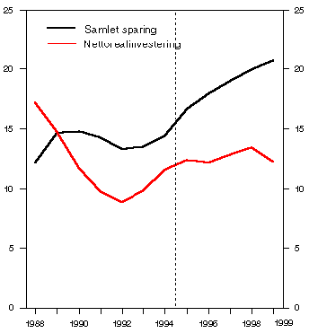 Oljeprisfallet i 1986 førte til betydelige underskudd på driftsbalansen overfor utlandet i perioden 1986-88. I disse årene var dermed samlet sparing i økonomien lavere enn nettorealinvesteringene, jf. figur 2.30. Utover i perioden ventes den samlede sparingen å øke mer enn nettorealinvesteringene. De betydelige overskuddene på driftsbalansen som er anslått gjennom beregningsperioden, skyldes mao. at nettorealinvesteringene forventes å holde seg relativt lave.