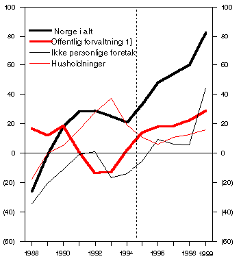 Overskudd i utenriksøkonomien motsvares definisjonsmessig av like store nettofinansinvesteringer for de innenlandske sektorene sett under ett. Husholdningene og ikke-personlige foretak har gått fra å ha betydelige negative nettofinansinvesteringer på 1980-tallet til å ha positive nettofinansinvesteringer så langt på 1990-tallet, jf. figur 2.31. En anslår nå at ikke-personlige foretak vil fortsette å bygge opp finansformuen også utover i beregningsperioden, mens husholdningenes finansformue ventes å være om lag uendret i år og til neste år, for så å falle noe mot slutten av perioden. For foretakssektoren er det særlig petroleumssektorens finansinvesteringer som øker utover i perioden, mens finansinvesteringene for øvrige bedrifter i Fastlands-Norge, som har vært positive på begynnelsen av 1990-tallet, faller svakt. Det må imidlertid understrekes at det er meget stor usikkerhet knyttet til fordelingen av nettofinansinvesteringene mellom foretakssektoren og husholdningene, også i de historiske tallene. Offentlig forvaltning hadde positive nettofinansinvesteringer gjennom hele 1980-tallet med en topp i 1985. Siden har offentlig forvaltnings netto finansinvesteringer falt, og i perioden 1991-94 var de negative. Fra og med 1995 og utover i perioden venter en imidlertid at offentlig forvaltning igjen vil ha positive nettofinansinvesteringer, jf. nærmere omtale i avsnitt 3.1.