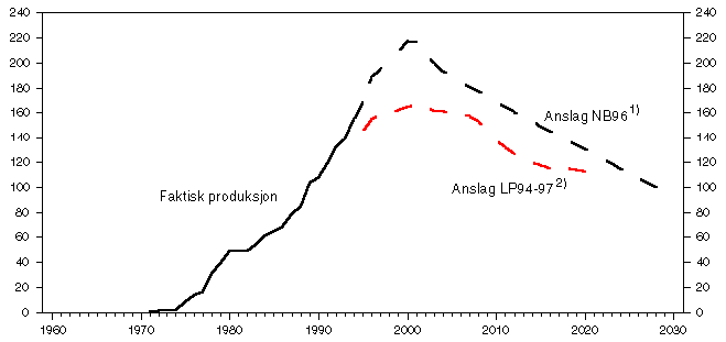 I forhold til Revidert nasjonalbudsjett er anslaget for oljeproduksjonen i perioden 1995-2004 justert opp med om lag 70 mtoe. Anslaget for gassproduksjonen er redusert med 9 mtoe. Oppjusteringen av anslaget for oljeproduksjonen skyldes bl.a. at Oljedirektoratet nå også har innarbeidet anslag for tilleggsutvinning fra enkelte av de mellomstore oljefeltene på sokkelen. I Revidert nasjonalbudsjett var slike anslag bare innarbeidet for de største oljefeltene. Det er grunn til å understreke at det fortsatt er stor usikkerhet knyttet til produksjonsanslagene. Den teknologiske utviklingen bidrar til stadig bedre reservoarforståelse, og dermed bl.a. til muligheter for høyere utvinning. Samtidig vil ny teknologi bidra til at forekomster på større havdyp og mindre forekomster i nærheten av eksisterende installasjoner, blir økonomisk utvinnbare.