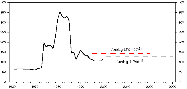 På bakgrunn av utviklingen hittil i år samt utsiktene for oljemarkedet i tiden framover har en i denne meldingen valgt å nedjustere oljeprisforutsetningen for 1995 med 7 kroner i forhold til Revidert nasjonalbudsjett til 108 kroner pr. fat. For 1996 og årene videre fram til 1999 har en lagt til grunn en beregningsteknisk forutsetning om en oljepris på 105 1996-kroner pr. fat, en nedjustering med 10 1996-kroner pr. fat i alle år. Usikkerheten i olje- og valutamarkedene innebærer en risiko for at oljeprisen i kroner i enkeltår kan avvike betydelig fra den prisutviklingen en her har lagt til grunn. For de langsiktige framskrivingene har en i denne meldingen valgt å opprettholde den beregningstekniske forutsetningen i Revidert nasjonalbudsjett om en oljepris på 125 1996-kroner pr. fat i alle år fra og med 2000.