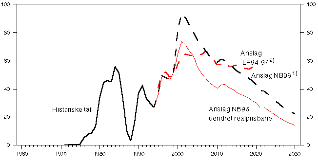 Virkningene i 1996 av en endring i oljeprisen på 10 kroner pr. fat i forhold til prisforutsetningen om 105 kroner pr. fat, er vist i tabell 2.19. I figur 2.34 illustreres dessuten utviklingen i statens netto kontantstrøm fra petroleumsvirksomheten dersom oljeprisen i alle årene i perioden 1996-2030 skulle bli 105 1996-kroner pr. fat, dvs. en nedjustering på 20 kroner pr. fat i årene fra og med 2000.