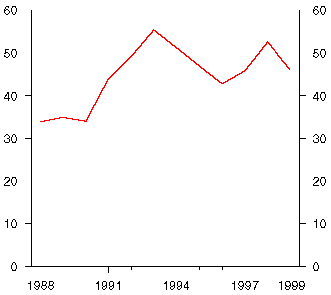 De samlede investeringskostnadene i oljevirksomheten økte kraftig i perioden 1988 til 1993, jf. figur 2.35, mens de falt noe fra 1993 til 1994 og utgjorde i fjor 51 mrd. 1992-kroner, ifølge reviderte nasjonalregnskapstall. Blant annet på bakgrunn av anslag fra Nærings- og energidepartementet er det lagt til grunn en volumnedgang i de samlede oljeinvesteringene for inneværende år på 8 pst. og en nedgang på 9 pst. til neste år. Dette representerer et fall i etterspørselsimpulser mot fastlandsøkonomien i 1995 på knapt 3 mrd. 1992-kroner og nær 3 1/2 mrd. 1992-kroner i 1996, når en tar hensyn til anslått utvikling i direkte import tilknyttet oljevirksomheten. Målt som andel av BNP for Fastlands-Norge tilsvarer etterspørselsfallet 1/2 pst. både i 1995 og i 1996. Sammenliknet med til Revidert nasjonalbudsjett er det nå lagt til grunn et noe mindre fall i etterspørselsimpulser for 1995, mens bildet for 1996 er om lag det samme.