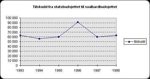 Tilskuddsbeløpene er omregnet til 1998-nivå i henhold til generelle prisindekser, etter samme prinsipp som ved de årlige prisomregningene. Det høye tilskuddsbeløpet i 1996 skyldtes tilleggsbevilgninger til Sysselmannen på grunn av flyulykken på Svalbard i august 1996 og bevilgning til nytt administrasjonsbygg for Sysselmannen, etter at det gamle brant i november 1996. Utgiftene til oppbyggingen ble imidlertid ikke utgiftsført før i 1997, se budsjettets del C kap 20 Statens bygninger i Longyearbyen.