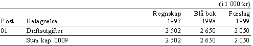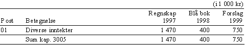 Regnskapstallet for 1997 omfatter fullmakter fra Miljøverndepartementet. I tallet for Blå bok for 1998 er slike fullmakter ikke tatt inn. For 1999 framgår posteringsfullmakten fra Miljøverndepartementet som gjelder avlønning av miljøvernsjefen, av bevilgningsforslaget, både av kap 5 og kap 3005, jf omtalen i kap 5 Sysselmannen. Eventuelle lønnstilskudd fra Miljøverndepartementet ut over miljøvernsjefsstillingen vil bli gitt som posteringsfullmakter og vil bli inntektsført kap 3005.