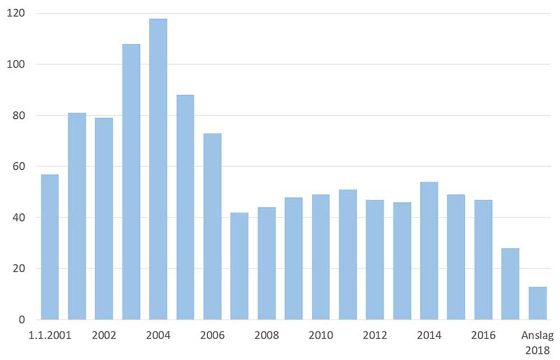 Søylediagram som viser antall kommuner i ROBEK 2001-20018