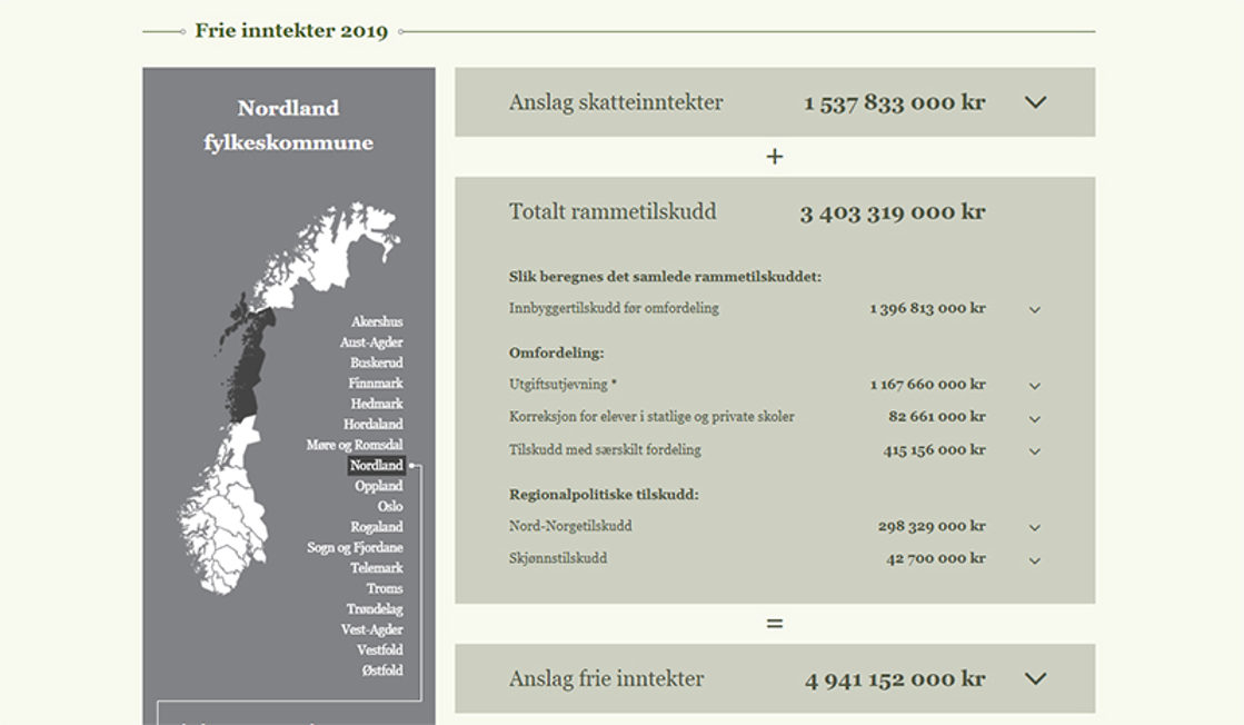 Kommunal- og moderniseringsdepartementet har en egen nettside der du enkelt finner fram til fordelingen av rammetilskuddet og anslaget på skatteinntektene for 2019 for din kommune eller fylkeskommune. Du kan også klikke på de enkelte elementene i oversikten, og du får en forklaring på hva disse består av og hvordan de er regnet ut.