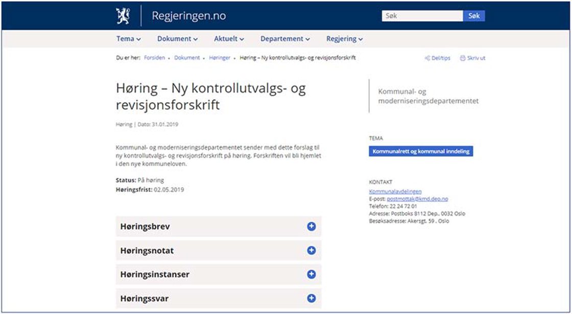 I den forbindelsen sendte departementet 31. januar forslag til ny kontrollutvalgs- og revisjonsforskrift på høring. Denne vil erstatte to av dagens forskrifter (kontrollutvalgsforskriften og revisjonsforskriften).