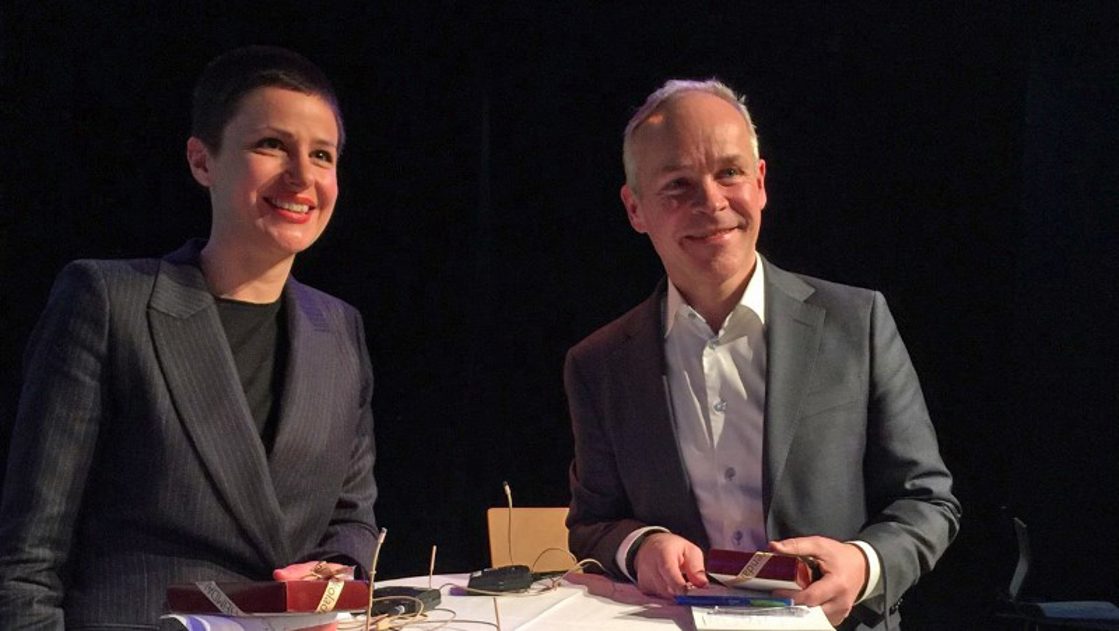 Kommunal- og moderniseringsminister Jan Tore Sanner i samtale med president i Norske arkitekters landsforbund (NAL), Alexandria Algard.