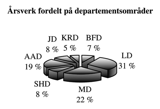 Av departementsområdets samlede utgiftsside er om lag 75 pst. (i underkant av 13,5 mrd. kroner) knyttet opp mot regelstyrte, lovpålagte og/eller avtalefestede overføringer til pensjonsutbetalinger, arbeidsmarkedstiltak, og andre tilskuddsordninger. 9 pst. knytter seg tilsvarende til statlig bygg- og anleggsvirksomhet, mens de resterende 16 pst. (i underkant av 3 mrd. kroner) er rene driftsutgifter. Departementets driftsutgifter utgjør i underkant av 0,2 mrd. kroner.
