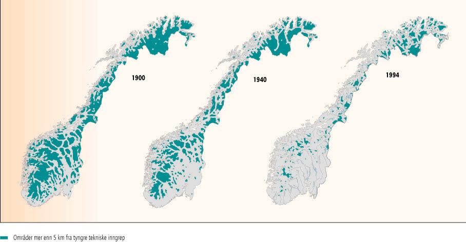 - Figur 11.1 Gjenværende områder med villmarkspreg (områder mer enn fem km fra inngrep) 1900, 1940 og 1994. (Kilde: GRID - Arendal, Statens kartverk. Bearbeiding: DN )