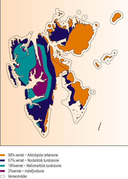 Svalbard, Jan Mayen og de nordligste delene av Barentsregionen omfatter Europas siste, store, inngrepsfrie naturområder. De siste årtiers naturinngrep har imidlertid redusert de villmarkspregede områdene betydelig, også i Europas nordligste utkant. Unntak er Svalbard og Jan Mayen der så godt som hele øygruppene har bevart sitt villmarkspreg. Hele 56 prosent av Svalbards samlede landområder er vernet, og verneområdene strekker seg ut til 4 nm fra kysten. Dette omfatter fuglereservater, naturreservater, nasjonalparker, artsfredninger. Flere naturtyper i den mellomarktiske tundrasonen er imidlertid svakt representert i verneområdene. De underrepresenterte områdene utgjør samtidig de mest produktive landområdene, f.eks indre fjordsoner på øygruppa, jf. figur. 11.11.