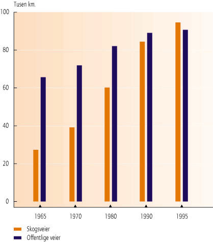 - Figur 11.2 Antall skogsveier og offentlige veier i hele landet. Kilometer. (Kilde: Landbruksdepartementet, Vegdirektoratet og SSB.)