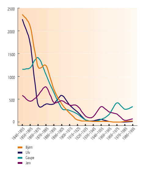 - Figur 11.3 Felling og annen avgang av ulv, bjørn, jerv og gaupe i Norge pr. 10-årsperioder i tidsrommet 1846 - 1995. Tallmateriale for avgang av gaupe mangler for årene 1985 og 1986. (Kilde: SSB)