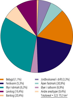 - Figur 11.4 Fordeling av økosystemer i Norge. Prosent av totalt landareal. (Kilde: Statens kartverk, SSB og NIJOS)