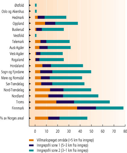 Villmarkspreget område er definert som områder mer enn 5 km fra tyngre tekniske inngrep. Omfanget av inngrep har vært spesielt stort de siste 30 - 40 årene. De største villmarkspregede naturområdene ligger i dag som "restområder" i fjell- og viddetrakter, og i nordlige deler av landet. I Oslo, Akershus, Østfold og Vestfold er det ingen villmarkspregede områder igjen, jf. figur 11.5. I alt 271 kommuner (60 prosent av kommunene) har mindre enn æn km 2> villmarkspreget areal.