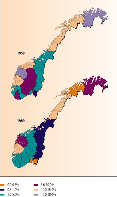 Slåtteenger har gått nærmest helt ut av bruk og beitemarker har i stor grad vokst igjen. I 1959 var slåttearealet i store deler av Norge på over 10 prosent av det totale jordbruksarealet. Det er store geografiske forskjeller, men 30 år etter, i 1989, var natureng til slått redusert til under 5 prosent i store deler av landet og i enkelte områder til under 0,5 prosent, jf. figur 11.6. Tendensen er fortsatt reduksjon av de gamle kulturmarkene.
