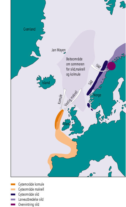Boks 11.4 Sild som nøkkelartNorsk vårgytende sild vandrer om våren fra gyteområdene langs kysten av Vest-Norge og ut i Norskehavet for å beite på årets produksjon av dyreplankton. I løpet av noen måneder om våren og sommeren øker vekten på den enkelte sild med 20 - 25 prosent. Resten av året spiser silda svært lite. På ettersommeren vandrer den store sildemengden østover til overvintringsområdene i og omkring Vestfjorden. Ved årsskiftet vandrer silda sørover til gytefeltene. Ungsilda vokser opp i Barentshavet. I den tiden bestanden av norsk vårgytende sild oppholder seg i norske farvann, blir fødetilbudet for fisk, fugl og sjøpattedyr kraftig bedret. Farvannene langs norskekysten har ikke i seg selv et produksjonspotensial som kan opprettholde store bestander av fisk, fugl og sjøpattedyr, men er avhengige av det næringstilskuddet som silda frakter med seg fra Norskehavet. Bestanden av norsk vårgytende sild ble fisket helt ned i slutten av 1960-årene. Først fra midten av 1980-tallet økte gytebestanden igjen. I denne perioden sluttet bestanden å fungere som bindeledd for næring mellom Norskehavet og kysten. Fødetilbudet for fisk, sjøfugl og sjøpattedyr langs kysten ble sterkt redusert. I den perioden silda var borte, overtok kolmule og til dels makrell deler av beiteområdene i Norskehavet. Overføringen av næring gikk da sørover istedenfor til norskekysten. Langs kysten var det sjøfugl som ble sterkest skadelidende når silda forsvant. Både måker, terner, toppskarv og lunde ble kraftig redusert. Sterkest gikk det ut over sildemåkebestanden som ble redusert med bortimot 90 prosent. I Barentshavet bidro fraværet av ungsilden til en sterk økning i loddeforekomstene. Loddebestanden har imidlertid store naturlige svingninger, slik at denne utgjorde en mye mer ustabil matkilde for torsk og sjøpattedyr. Når lodda så forsvant på 1980-tallet før silda tok seg opp, førte dette bl.a. til kraftig nedgang i torskebestanden og store selvandringer langs kysten. I 1997 vil gytebestanden være i størrelsesorden 7 milloner tonn. Dette er på høyde med forholdene i 1950-årene. Fra 1998 regner imidlertid forskerne med at gytebestanden vil gå nedover igjen pga. dårlig rekruttering av kjønnsmoden fisk. Figur - Vandringsruter for norsk vårgytende sild, makrell og komule. (Kilde: Havforskningsinstituttet) |
