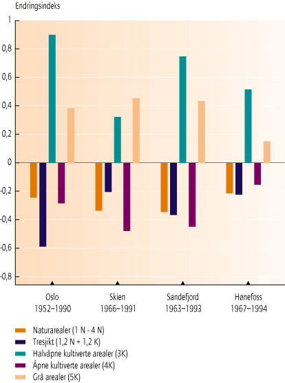 - Figur 12.1 Endring i forekomsten av ulike grønnstrukturkategorier i noen norske byer og tettsteder. (Kilde: Nyhuus og Thorén 1996.)