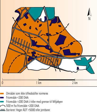 I byer og tettsteder er det registrert underdekning på tilgjengelig nærturterreng, dvs. naturområder på mer enn 200 dekar ikke lenger enn 500 m fra bolig uten å krysse sterkt trafikkerte veger, jf. eksempelet i figur 12.2.