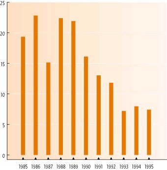 - Figur 15.10 Konsentrasjonen av kobber (µg/liter) i Orkla ved Vormstad. 1985 -1995 (Kilde: NIVA)